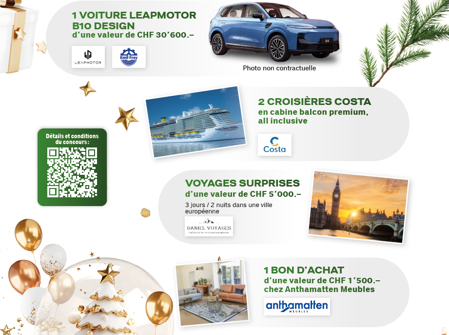 Tout versement en espèces, échange ou transfert à titre onéreux ou gratuit (par exemple revente, mise aux enchères, don, etc.) de tout ou partie du prix est expressément exclu. En cas de non-respect du règlement, Coop se réserve le droit de retenir tout ou partie du prix. Coop ainsi que les sociétés du groupe et les tiers mandatés par elles déclinent toute responsabilité en lien avec l’organisation du jeu-concours, ainsi qu’avec l’attribution du prix. Aucune correspondance ne sera échangée au sujet du jeu-concours. Seul le droit matériel suisse est applicable. Tout recours juridique est exclu.