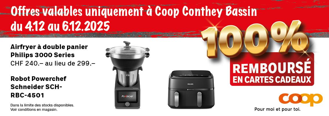 A l'achat d'un robot Powerchef Schneider à CHF 240.- à la place de CHF 539.- ou d'un Airfryer Philips, Coop te rembourse le même montant en cartes cadeaux Coop (divisées en carte de CHF 20.-, valable chaque mois). Dans la limite des stocks disponibles.
